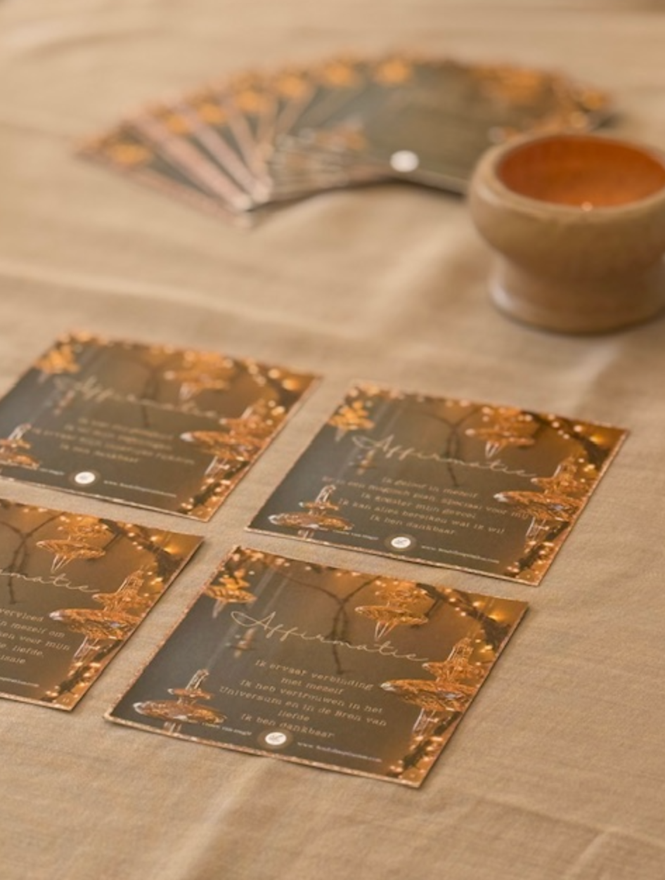 Affirmatie kaarten, dubbelzijdig full color. Alle kanten hebben verschillende affirmaties. Wordt geleverd in een gouden opbergzakje voor € 35,-. (zie foto’s)